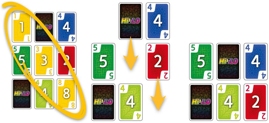Point spécial :si vous avez 3 cartes de la même couleur alilgnées (horizontalement, en diagonal, ou vertical) alors vous faites un "hilo" : toutes les cartes en question peuvent être défausser. (Attention la carte avec la valeur la plus petite doit restée sur le dessus de la pile de défausse).