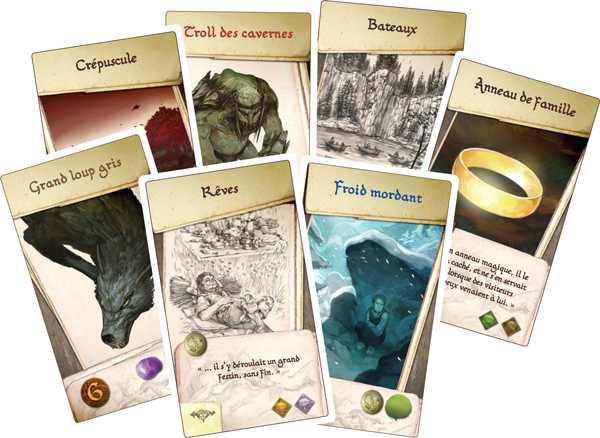 Cette boîte contient un livret de règles, 1 plateau, 75 cartes d’Aventures, 40 cartes de Péril, 5 sous-verres, un assortiment de pions et un Dé du Destin L’Anneau Unique à douze faces.