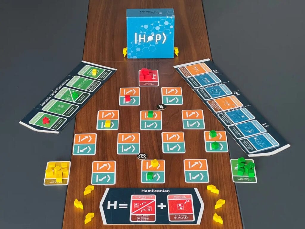 |HOP> est un jeu de stratégie rapide, nerveux et sans aléatoire sur le thème de la physique quantique. Très rejouable, il a pour but de vulgariser des grands principes de physique quantique tout en gardant l’attention de ses joueurs au travers une maîtrise tactique complète.