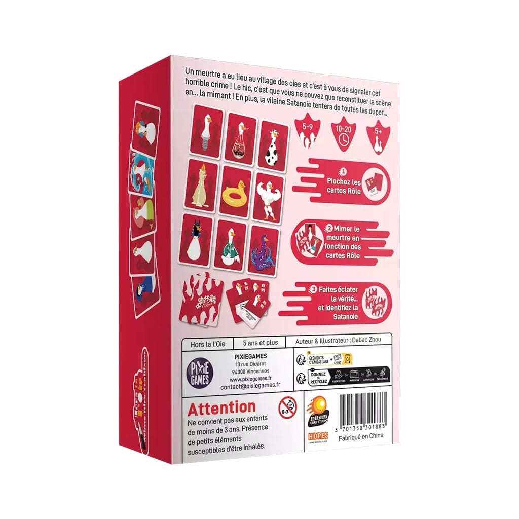 L’Oie Dragon a occis la timide Oie Banane ! Au témoin de s’armer de créativité et de réveiller son voisin pour lui mimer la terrible scène... Est-ce une oie T-Rex qui a achevé la pauvre Oie Falbala, ou bien une oie Mexicaine ? Difficile à dire…