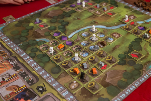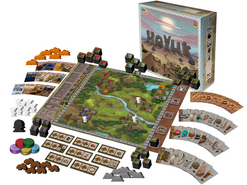 Höyük est un jeu qui se joue sans plateau. Le village en miniature se développe sur la table en utilisant des pièces carrées représentant les maisons.
