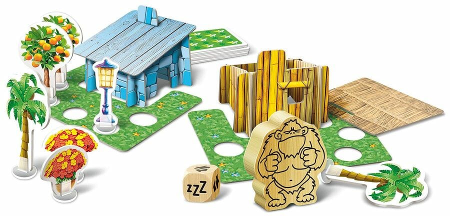 Chaque joueur commence avec une hutte (composée de 5 parties), un jardin vide, avec 5 espaces pour un joli décor de jardin et 3 cartes d'action, qui peuvent être : Construire (décor), Déplacer (le singe qui dort), Réveiller (le singe), Banane (pour les mauvais moments).