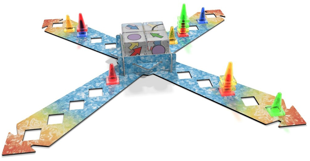 Un froid glacial s’est abattu sur le cercle polaire. Même la boussole est givrée ! Emprisonnées dans d’épais blocs de glace, ses aiguilles s’affolent. À vous de les tourner et de les faire pivoter dans tous les sens pour fuir cette station polaire. Pour cela, vous devrez amener les flèches de votre boussole sur la face supérieure des cubes de glace ; elles vous indiqueront la direction à suivre. Servez-vous aussi de vos adversaires pour vous déplacer et atteindre des contrées plus chaudes. Aurez-vous le sens de l’orientation ?