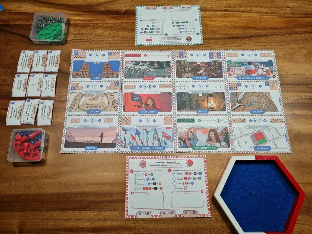 I'm not afraid est un jeu qui consiste à obtenir la majorité pour sa cause. Il montre la réalité complexe de mouvements concurrents, l'un se battant pour conserver le pouvoir autoritaire et l'autre luttant pour changer le système. Les lieux contestés comprennent : les principales villes, les principaux groupes et les principaux syndicats. Le jeu se poursuit jusqu'à ce que l'un des leaders obtienne la majorité de ses partisans dans cinq lieux. Une fois que vous avez obtenu une tâche spéciale grâce aux cartes bonus, vous recevez des points ainsi qu'un avantage en lançant plus de dés. À la fin de la partie, les joueurs marquent des points (les points indiqués sur les lieux) et des tableaux d'utilisateurs. Le joueur qui a le plus de points gagne. En cas d'égalité, le joueur qui a placé 5 meeples sur des lieux gagne.