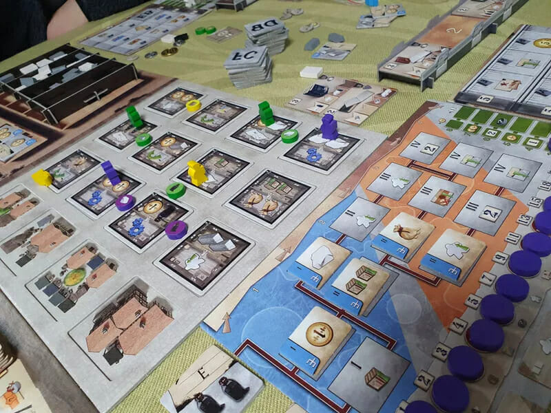 Placer une tuile de la réserve commune chez le typographe. Vous avez autant de pas avec votre ouvrier que de tuiles qui se trouvent sur la même ligne et colonne où vous avez placé la nouvelle tuile. Vous déplacez un de vos assistants dans un magasin adjacent dans une pièce choisie.