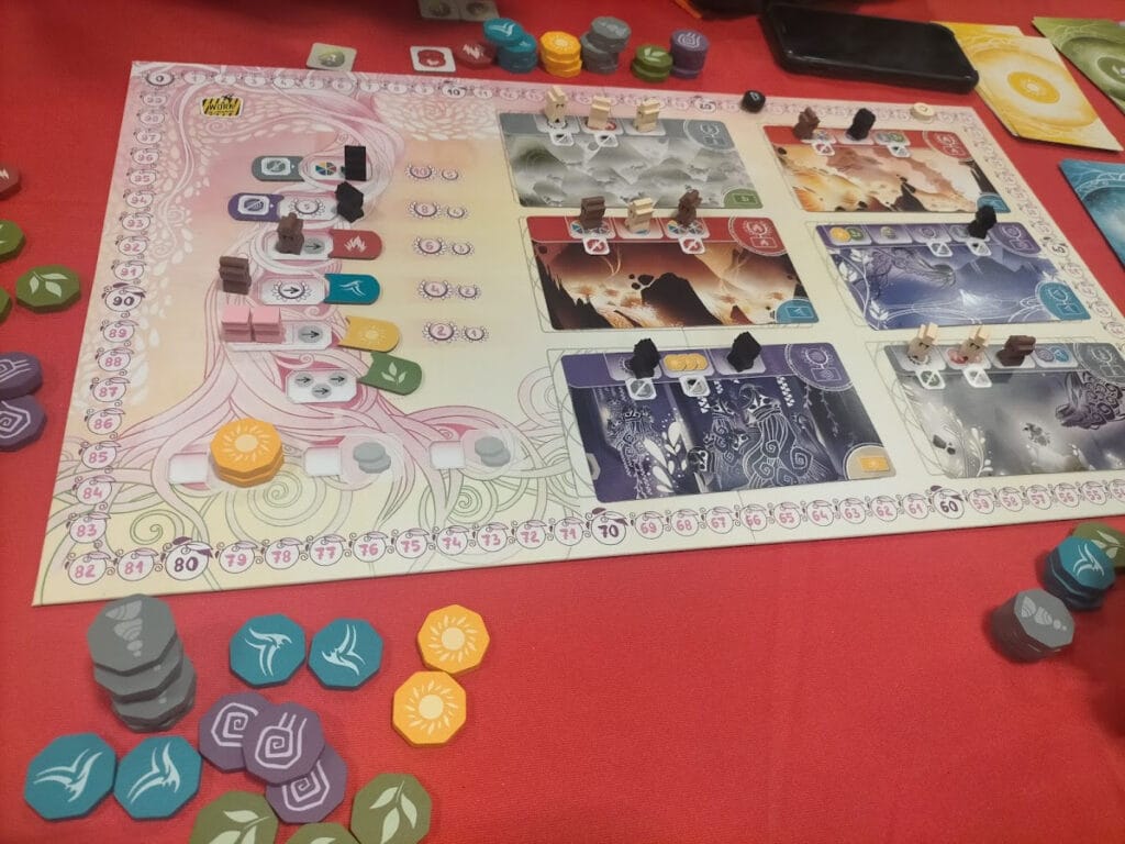 À la fin de la partie, ce sont les offrandes placées sur l’arbre et leur couleur qui offre un gain de points, en fonction des joueurs ayant le plus de faveurs de chaque couleur.
