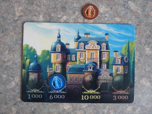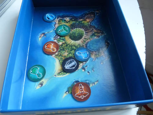 - 1 Île : dessinée à lʼintérieur du couvercle de la boîte. 5 Châteaux : 1 orange, 1 noir, 1 blanc, 1 bleu et 1 vert. 40 Conseillers aux couleurs des 5 châteaux. Soit 2 chimistes, 2 écrivains, 2 médecins et 2 religieux par couleur. 150 Billets au total, de 3 valeurs : 1000, 5000 et 10000 ducats. Soit 50 de chaque.