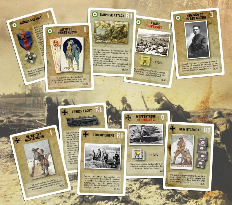 Les 2 ½ planches de pions contiennent l’OB complet de tous les belligérants, depuis les tenaces « Alpini » italiens jusqu’au redoutable « Alpenkorps » allemand, en passant par les « Kaiserjager » tyroliens, les divisions hongroises « Honved » ou les « Chasseurs des Alpes » français.