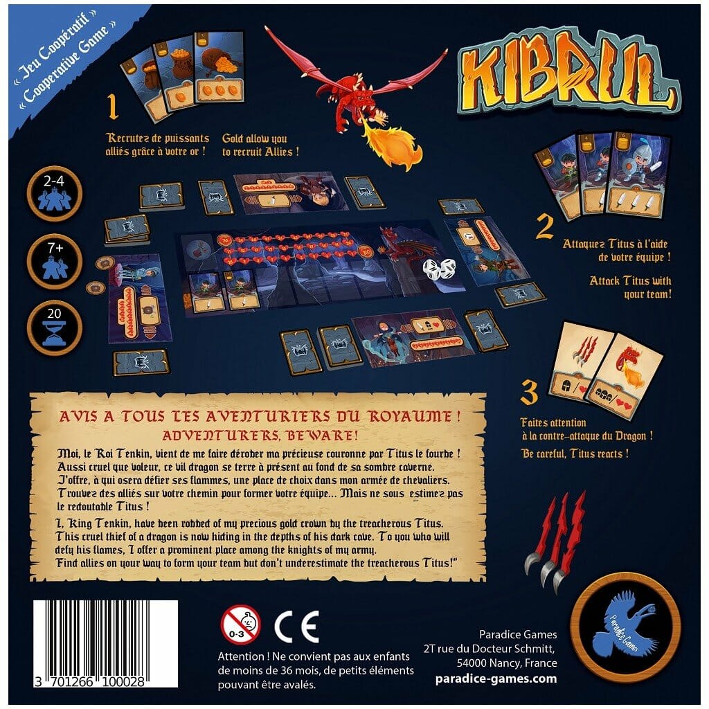 Kibrul est un jeu coopératif d’initiation au deck-building, pour toute la famille. Au cours d'une partie, vous devez recruter des cartes d’Allié pour renforcer votre équipe et attaquer Titus pour faire baisser ses points de vie et récupérer la couronne du Roi.