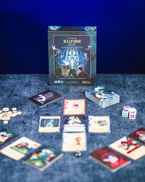 Kinfire Delve : Vainglory's Grotto est un jeu de cartes tactique et coopératif pour 1 ou 2 joueurs. En tant que chercheurs, vous devrez vous frayer un chemin parmi les cartes de défi du puits pour atteindre Vainglory, le maître du puits, et l'affronter dans un combat final épique. Pour vaincre Vainglory, vous devrez vous battre et résoudre des énigmes parmi les 57 cartes de défi du puits avant de faire face à son gantelet final. À votre tour, tentez un défi en jouant une carte de compétence correspondante et en lançant les dés.
