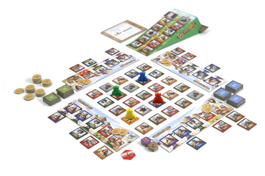 Au cours d'un tour, vous pouvez d'abord choisir d'acquérir une tuile de la "colline" pour le prix de l'or indiqué ; la colline comporte deux colonnes de six personnages, les personnages coûtant de 2 à 10 or en fonction de leur hauteur sur la colline. Lorsque vous acquérez une tuile, vous l'ajoutez à votre plateau de château personnel. Les personnages ont une influence de 0 à 5, les personnages de 1 à 5 étant classés par type et le bouffon de valeur 0 remplaçant un personnage de votre choix (mais valant toujours 0 influence). Vous déplacez ensuite votre roi orthogonalement ou en diagonale, en vous arrêtant sur la tuile de personnage que vous voulez réclamer ; vous pouvez aussi traverser 2 ou 3 personnages identiques en ligne, en vous arrêtant sur la case qui les suit afin de tous les collecter ! Ajoutez ces tuiles de personnage à votre plateau de château, et si vous avez maintenant des personnages face visible avec une influence de 1 à 5, vous pouvez les retourner face cachée pour réclamer un bonus de royaume en points et en pièces.