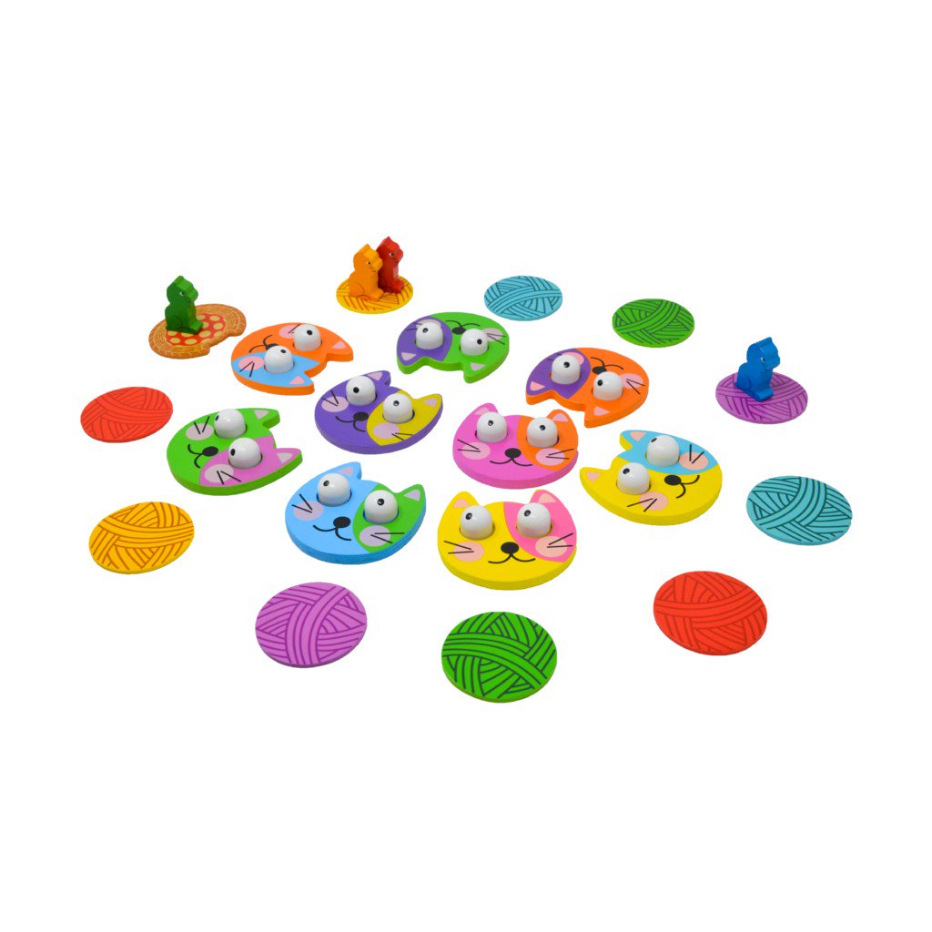 - 9 Chatons en bois 9 Maman Chat en bois avec 18 yeux 1 Panier 10 Pelotes de laine 2 Dés colorés