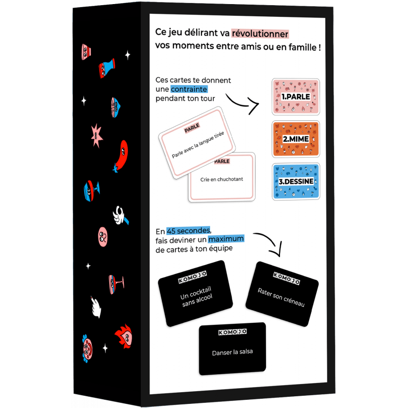Faites deviner un maximum de cartes Komojo en 45 secondes à ton équipe en décrivant les mots ou phrases de tes cartes.
