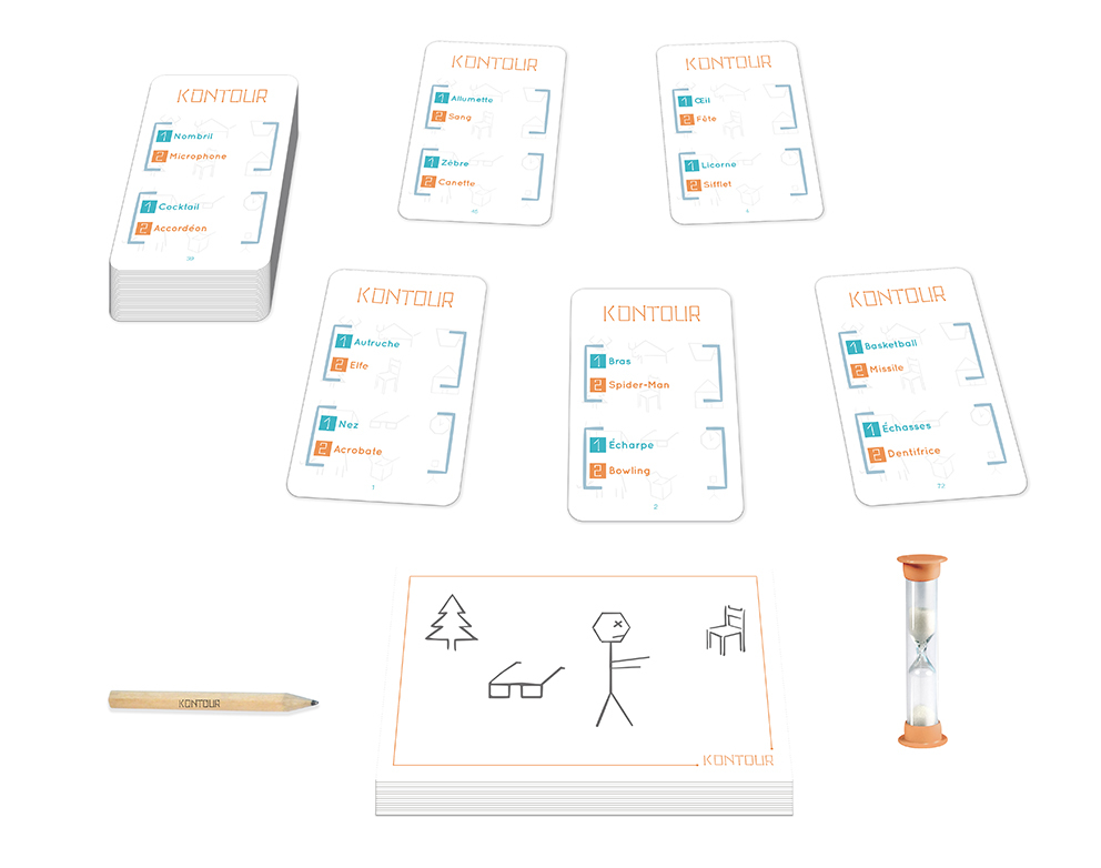 Le joueur qui dessine le plus mal commence et prend le bloc de dessin et le crayon. Il pioche la première carte de la pile et la retourne pour découvrir les mots proposés sur la face cachée de cette carte.