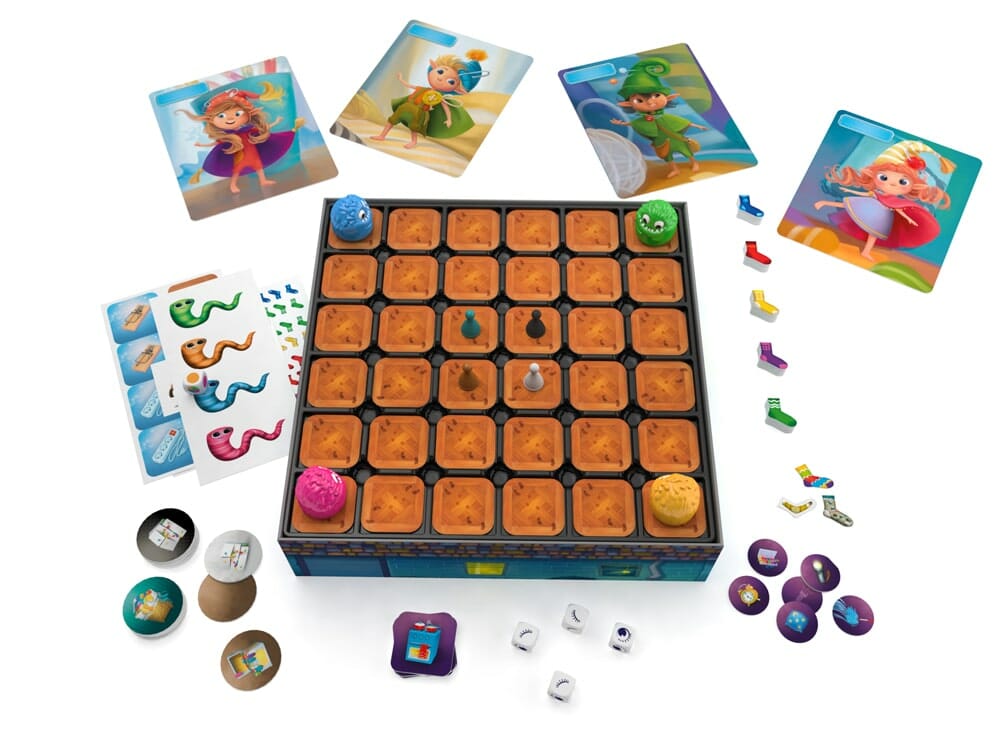 Mais le truc en plus de cette chasse aux chaussettes, c'est son côté évolutif. En effet, sous le plateau de jeu en 3D, dans le creux de la boite, se cachent une série de couvercles à ouvrir, correspondant à de nouvelles pièces qui s'ouvrent pour offrir de nouvelles règles et de nouveaux éléments de jeu.