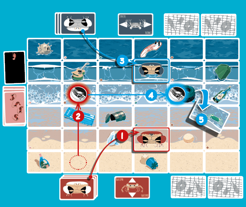 Tu déplaces, si tu veux, le jeton Crabes en ligne droite - l'un se déplace que verticalement, l'autre qu'horizontalement. En début de partie, chaque joueur prend connaissance secrètement de 2 Objets interdits. Si vous finissez votre déplacement sur un objet interdit c'est pas bon pour vous ! Vous perdez des crevettes et si vous êtes à sec, vous avez perdu la partie ! Si au contraire, vous avez bien joué et terminé votre déplacement sur un lieu qui ne contient pas d'objets interdits, alors vous avez libéré un copain crabe ! Il faut en libérer 8 pour l'emporter. Voilà pour les bases ;)