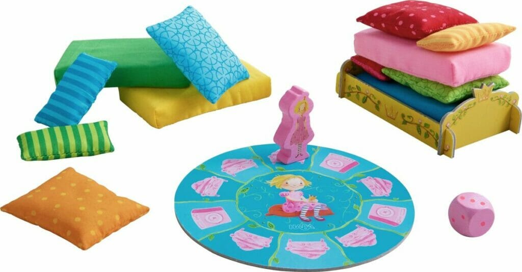 Un jeu de dextérité avec des contes de fées à lire. Les joueurs aident la princesse à empiler de nombreux matelas, oreillers et couvertures sur son lit.
