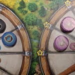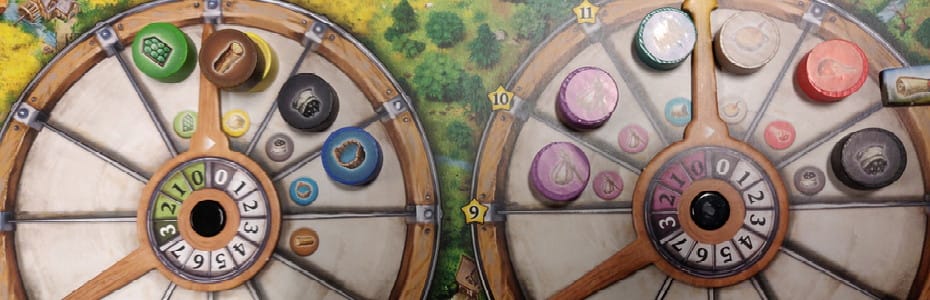 Le jeu propose aussi un système de gestion inspiré de Ora & Labora : la roue de ressources (cf photo). Quand vous gagnez des matières premières, vous les "stockez" sur les zones idoines de votre roue en faisant avancer l'aiguille correspondante. Mais nous avons également ici une 2e aiguille pour les matières transformées. Ces matières seront dépensées pour construire des batiments qui font gagner des points de victoire.