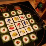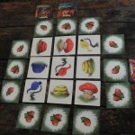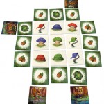 Sur la table vous disposez une "grille" de 3x3 cartes forêt : elles représentent toutes d'un côté et de l'autre des éléments différents : 3 motifs: « champignon », « feuille » et « caillou », en trois couleurs : jaune, rouge et bleu.