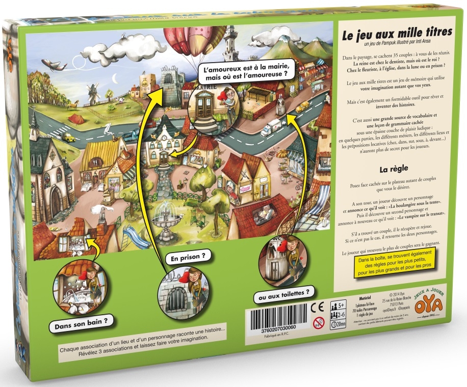 Le Jeu aux Mille Titres est un jeu de mémoire et d’imagination : Sur le grand tableau représentant un paysage, des couples sont placés face cachée. A son tour, un joueur retourne deux personnages et annonce à chaque fois son nom et où il se trouve : « Le fou dans la fontaine » et « le patron en prison » par exemple. S’il a retrouvé une paire (le fou et la folle par exemple), il la récupère et rejoue. Sinon, il recache les deux personnages et son tour est fini.