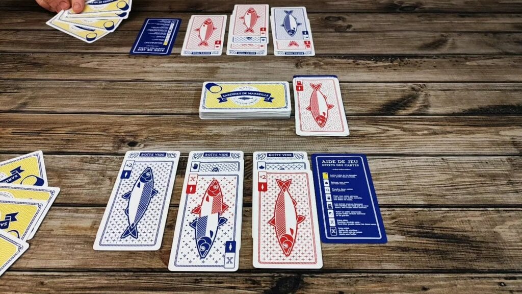 L’histoire dit que le port de Marseille a été bloqué par les sardines, la vérité serait plutôt qu’un bateau que tout le monde appelait la Sardine aurait bloqué le port. Mais pour le jeu, pas de bateau ni de port, mais de belles boîtes de sardine à remplir et à refermer en premier pour gagner. Deux démarrages possible, soit avec des boîtes vides, soit avec des boîtes contenant des condiments et donc des bonus.