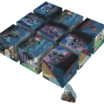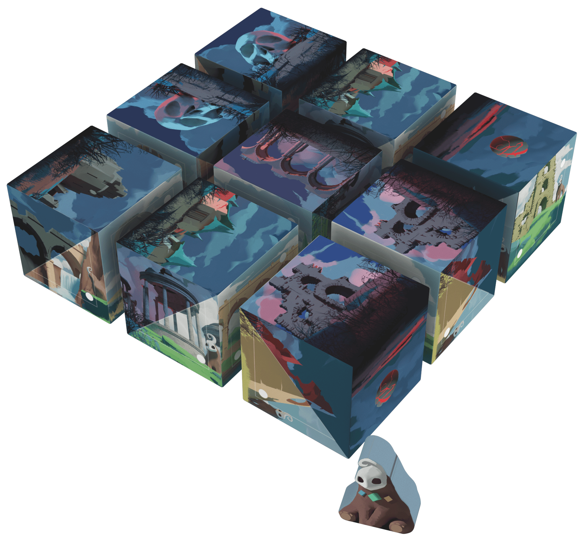 Pour commencer, placez les neuf cubes dans une grille de 3x3 en laissant de l'espace entre les cubes et en plaçant les faces sombres sur le dessus, puis placez le jeton de blocage sur le cube central. Chaque cube a deux faces foncées, deux faces mi-lumineuses (séparées en diagonale par un triangle foncé et un triangle clair, marqués d'un point blanc) et deux faces entièrement lumineuses (avec un point blanc sur chaque triangle). Chaque triangle clair compte pour 1 lumière, de sorte qu'un côté entièrement clair compte pour 2 lumières. Le joueur qui commence fait basculer un cube dans un espace ouvert et place Buh, le jeton de blocage, sur n'importe quel autre cube, puis le deuxième joueur commence le premier tour normal.