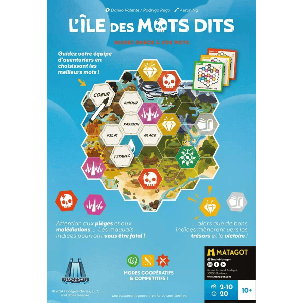 Dans le jeu L'Île des Mots Dits est jeu mêlant parcours, association d'idées et déduction, 2 à 10 joueurs s’affrontent ou coopèrent pour atteindre un objectif : retrouver le trésor tout en évitant les pièges disséminés sur l’île.