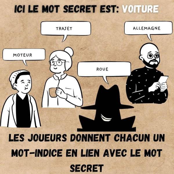 Chaque joueur connaît un mot secret sauf l’Imposteur, qui doit deviner ce mot en s’appuyant sur les indices fournis par les autres joueurs sans se faire démasquer.