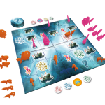 Les poissons (3 taille de figurine - petits, moyens et gros) se déplacent sur un plateau modulable de 6x6 cases.