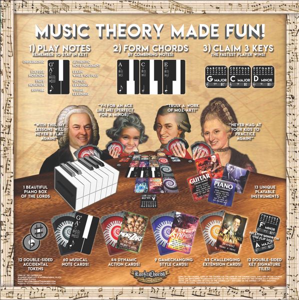 Lord of the Chords est un jeu de collection de jeux de dessin de cartes sur le thème de la musique classique pour 2 à 4 joueurs, avec une véritable théorie de la musique savamment tissée dans sa mécanique de jeu. Préparez-vous à vous amuser davantage, à apprendre de façon geek et à vous ennuyer moins !