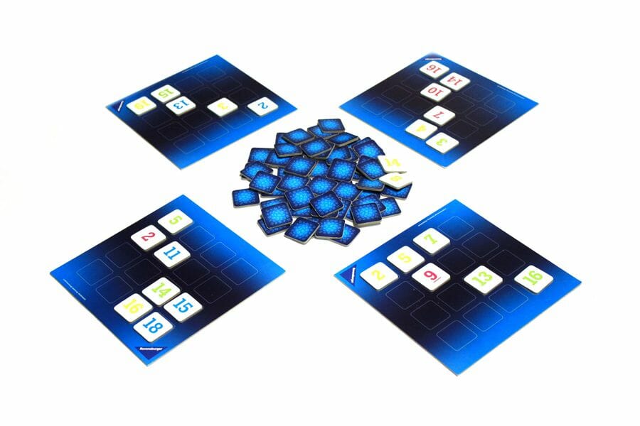 Plus précisément, chaque joueur commence le jeu avec un plateau de jeu portant une grille de 4x4 et vingt tuiles (numérotées de 1 à 20) pour chaque joueur sont mélangées face cachée dans leur pile de tirage. Pour commencer le jeu, chaque joueur tire simultanément une tuile, puis la place sur l'une des quatre cases de la ligne diagonale allant du haut-gauche au bas-droit de son tableau de joueur.
