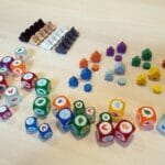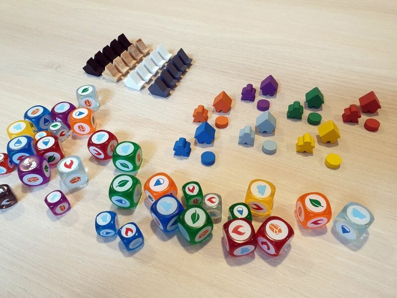 Dans la boîte se trouvent de nombreux dés colorés et deux plateaux de jeu pour deux expériences de jeu différentes. Vous devez donc parfois compter sur la chance, mais soyez aussi attentif à vos combinaisons de cartes.