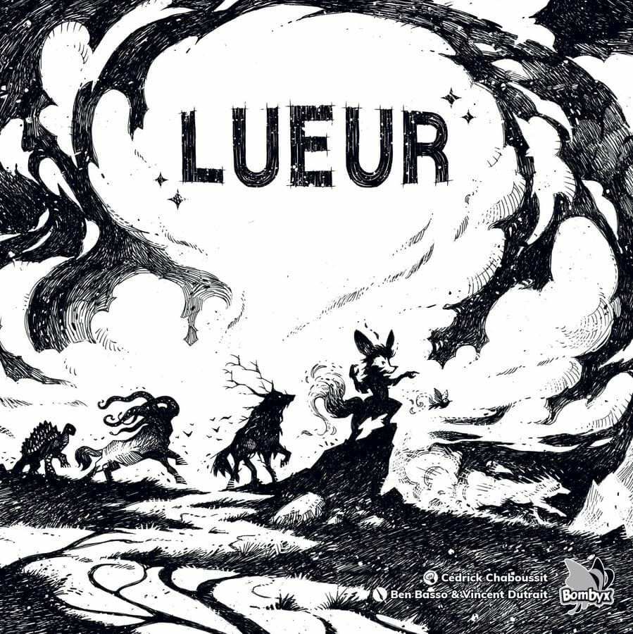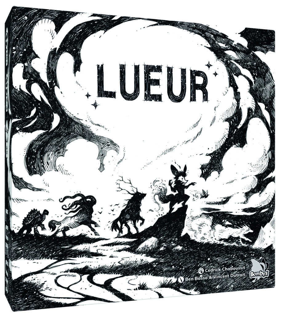 Lueur, un jeu de Cédrick Chaboussit illustré en noir et blanc par Ben Basso et Vincent Dutrait.