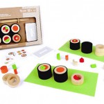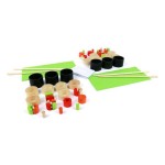 - 48 ingrédients en bois de couleur pour faire 6 makis 2 tapis verts 2 paires de baguettes de bambou 33 cartes avec des compositions de recettes et des instructions