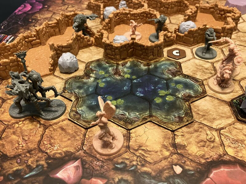 Les joueurs utilisent les dés et les statistiques des personnages pour se déplacer sur une grille d'hexagones et contrôler le château de Greyskull.