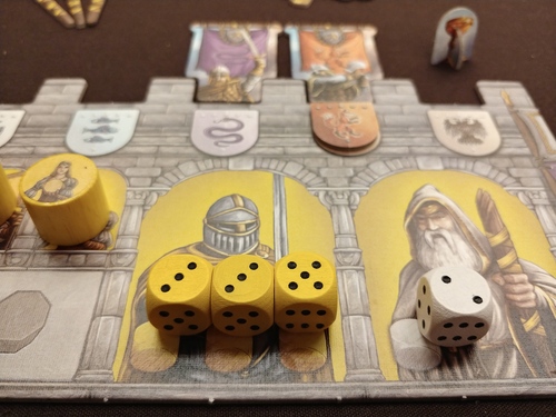 Les dés nous permettent de déplacer notre chevalier ou Merlin atour de la table ronde. Ceci afin de réaliser l'action de la case ou le pion termine. Le pion Merlin est déplacé par tous les joueurs.