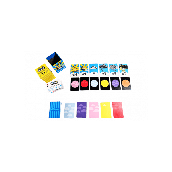 Dans Météo, les joueurs observent les couleurs du ciel pour prédire le temps qu’il fera et partir en vacances au bon moment. Mais attention, choisir trop tôt ou trop tard peut vous coûter cher ! Collectez des cartes de ciel et multipliez-les par les valeurs météorologiques pour cumuler des points.