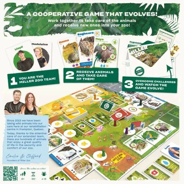 "Miller Zoo est LE jeu familial coopératif où vous incarnez l'équipe chargée de gérer l'un des zoos les plus intéressants du Canada !"