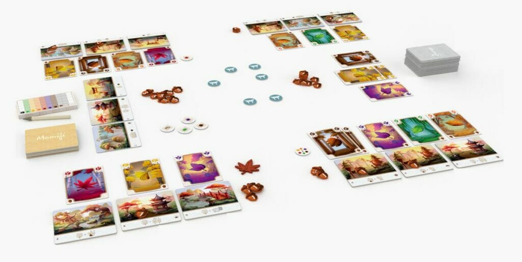 Dans Momiji, les joueurs tentent d'obtenir le plus de points de victoire et tentent d'atteindre leurs objectifs, en collectant les feuilles d'automne les plus précieuses du jardin impérial, dans l'ancien Japon.