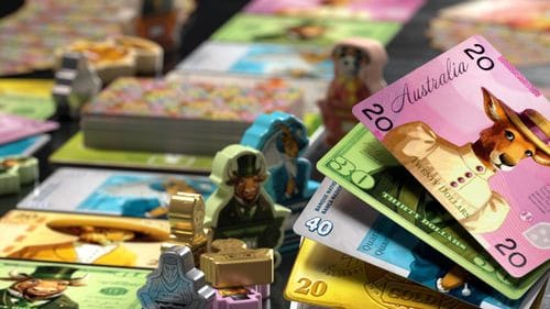 Chaque joueur commence avec une main de six cartes d'un jeu qui contient des cartes de sept devises d'une valeur comprise entre 20 et 60, ainsi que des pièces de monnaie d'une valeur de 10.