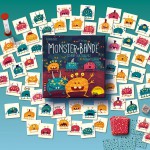 Monster-Bande contient 2 x 54 tuiles égales avec des images de monstres. Un jeu de tuiles forme une pile face vers le bas, l'autre est étalé ouvertement sur la table. De plus, il y a deux dés. Les faces des dés montrent les propriétés des monstres, comme les cornes, les pieds, la couleur, les nombres, etc.