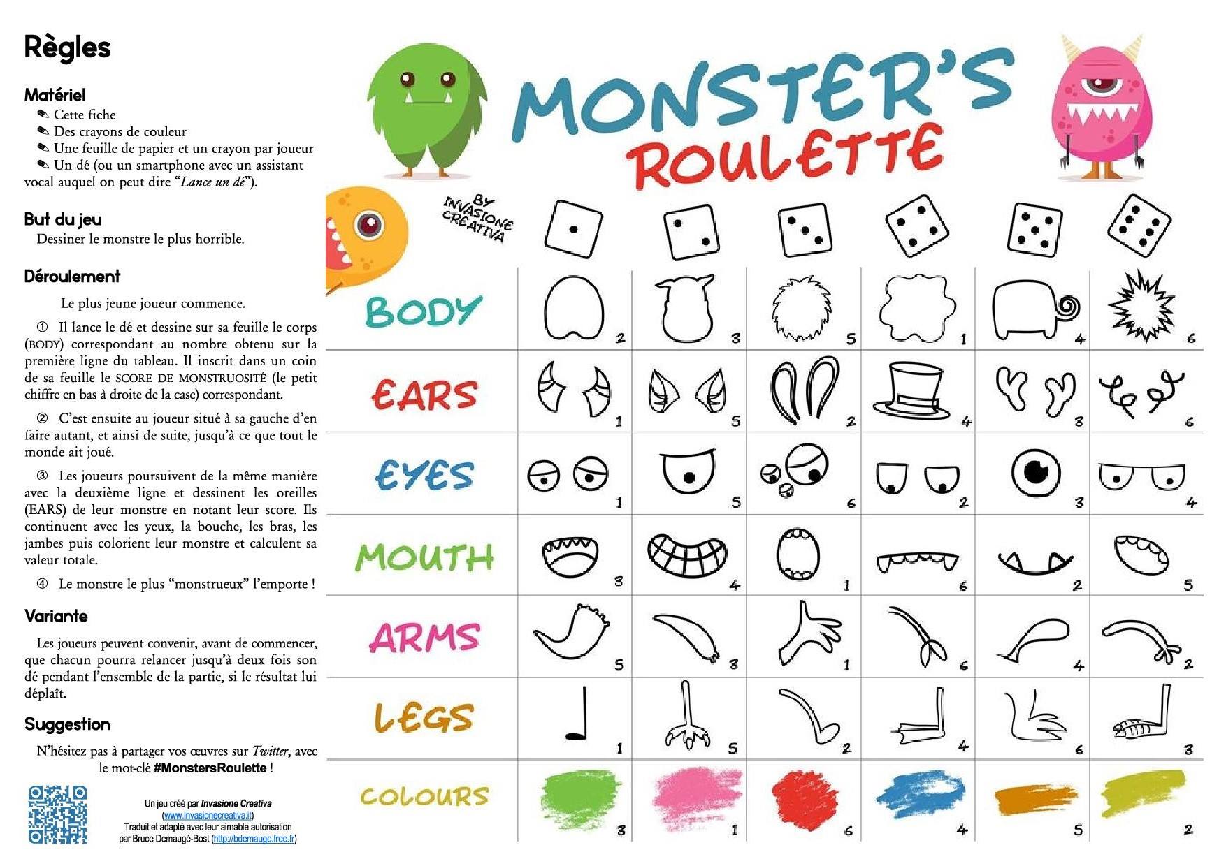 Lancez un dé, dessinez selon ce que le résultat indique une partie de votre monstre, et marquez des points de monstruosité !
