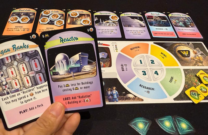 Plus précisément, à chaque tour, une carte est révélée du paquet commun, qui commence avec quatre cartes travail, deux cartes problème et deux cartes rebondissement. Pour le travail, chaque joueur effectue simultanément une action de son choix : exploiter des mines pour gagner de l'argent, cultiver pour se nourrir, faire des recherches pour obtenir des cartes, construire un nouveau bâtiment ou réapprovisionner les boîtes dans les bâtiments. Les rebondissements varient d'une partie à l'autre. Les problèmes ajoutent une nouvelle carte événement au paquet : famine, paperasse, pannes, accidents, fuites, coupures de courant... Tout ce qui peut mal tourner tournera mal, puis chaque fois que le paquet est mélangé, vous pouvez vous préparer à nouveau à tous ces événements.
