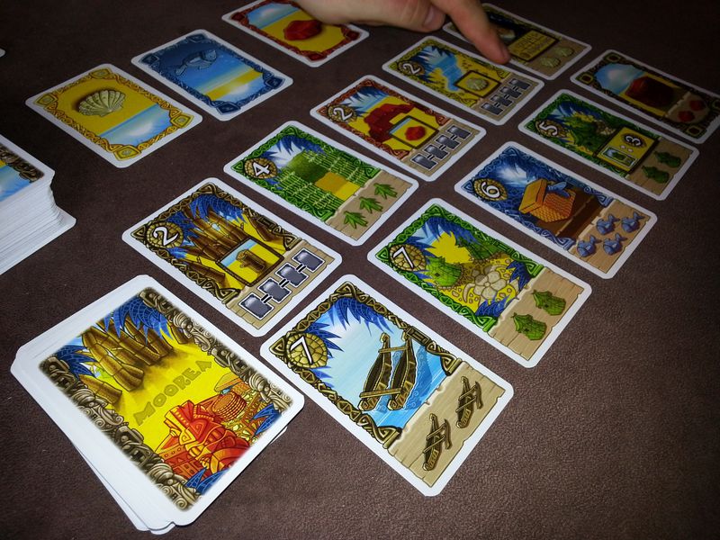 Chaque joueur de Moorea commence avec une main de six cartes de marchandises, avec trois de ces cartes placées face visible et le reste comme un jeu de cartes face cachée. Disposez les quatre types d'outils, puis dix cartes de produits dans un affichage face vers le haut ; les produits sont séparés en deux types, le plus facile à acquérir entrant en jeu en premier. Lors d'un tour, vous devez tirer une carte marchandise face cachée de la pioche, puis vous faites une action ou une passe, puis vous vous défaussez jusqu'à la limite de votre main, qui commence à six cartes.