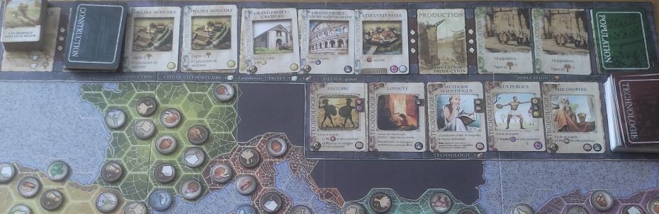 En 2021 Forbidden Games lançait la campagne Kickstarter pour une imposante boîte de jeu remplie de beaux matériaux nommé Mosaic : A story of Civilization. En 2023 la