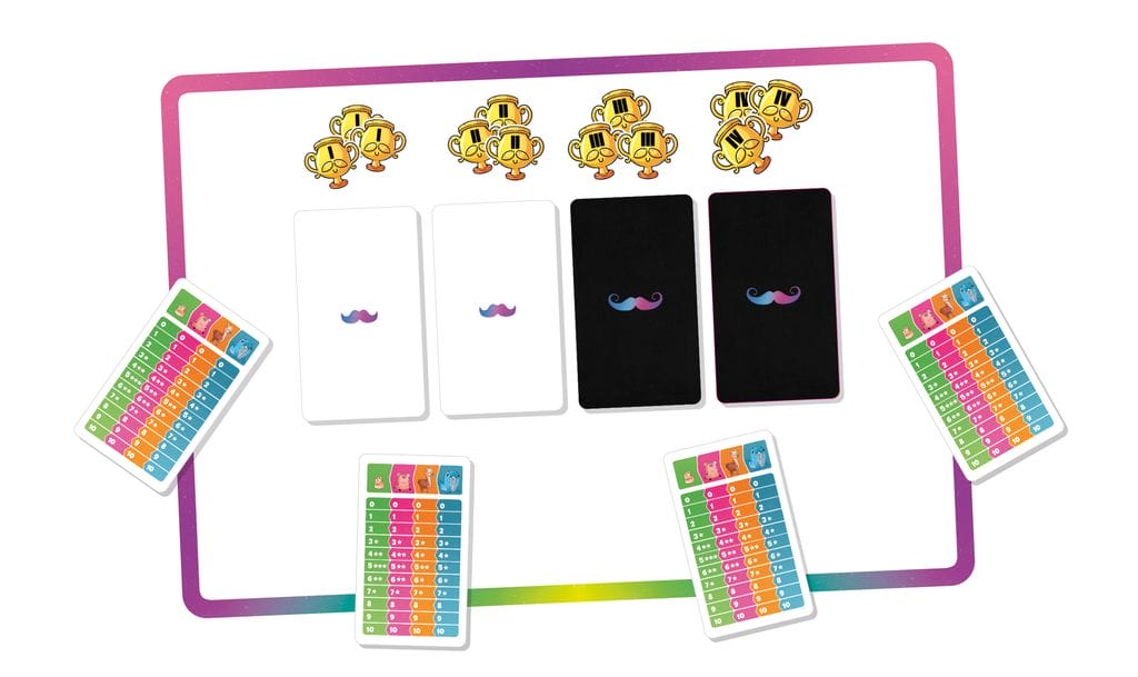 Moustache, c’est bien plus qu’un simple jeu de plis : c’est un concentré de stratégie, de chaos organisé et de surprises en cascade ! Ici, rien n’est figé : les équipes changent à chaque manche, les alliances se font et se défont, et de nouvelles règles viennent s’ajouter progressivement, transformant la partie au fil du temps. Chaque manche devient un mini-défi où il faut lire le jeu de ses adversaires… mais aussi de ses alliés temporaires. Bluff, adaptation et sens du timing sont de mise pour tirer votre épingle du jeu dans cette compétition en constante évolution.