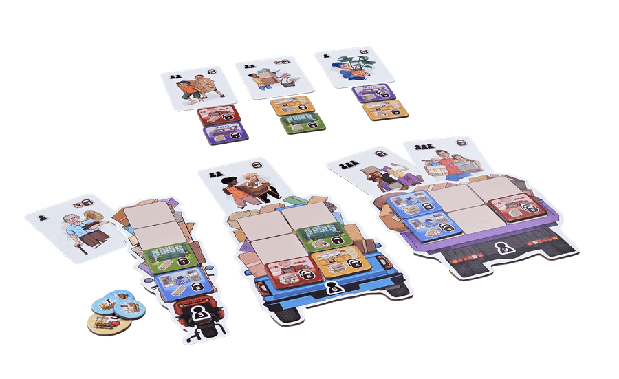 Chaque joueur a maintenant seize tuiles d'objets et huit cartes de personnes assignées à son véhicule, et il calcule son score :