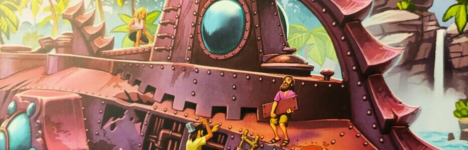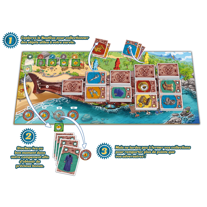 Dans NAUTILUS ISLAND, vous êtes des naufragés sur une île mystérieuse, déserte et volcanique. Après une tempête, vous tombez sur un sous-marin échoué et vide de son équipage : le Nautilus. Vous devrez en explorer les différents recoins pour récupérer le plus d’objets afin d’assurer votre survie et remettre en état le sous-marin pour quitter l’île avant les autres naufragés.