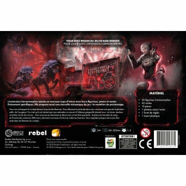 - 20 figurines 1 plateau Carnomorphes 5 aides de jeu 8 jetons Faucheur rouges 2 jetons Faucheur bleus 1 jeton Abomination 4 jetons Carcasse d’Intrus 20 cartes Attaque de Carnomorphe 20 cartes Événement 12 cartes Mutation de personnage 8 cartes Adaptation de Carnomorphe