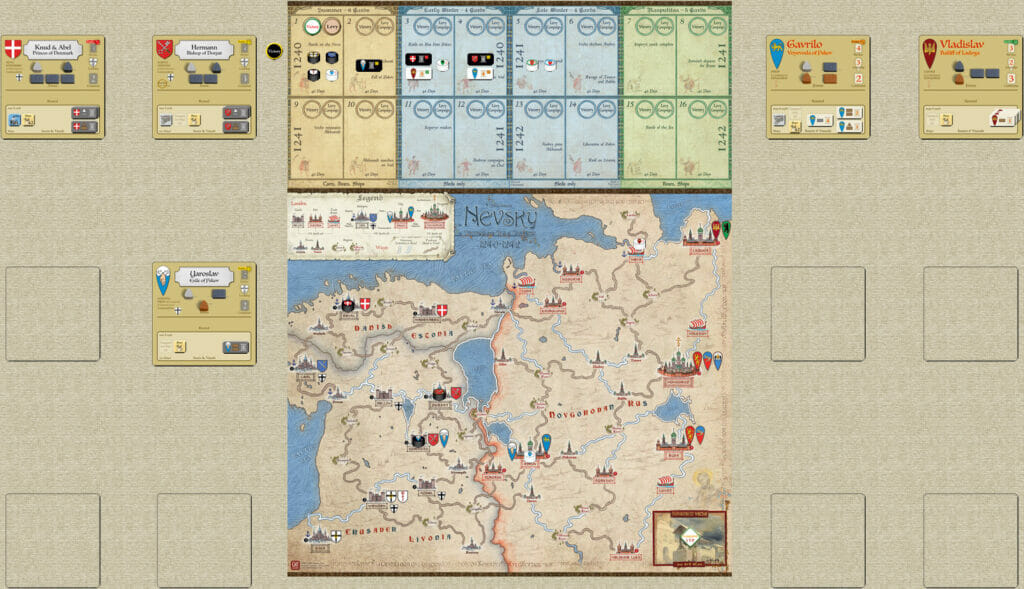 Tous les 40 jours, les camps engagent divers seigneurs et vassaux ainsi que leurs forces, leurs transports et leurs capacités, soutenus par des autorités politiques supérieures - un légat papal pour les Teutons et le conseil municipal de Novgorod (veche) pour les Russes. Chaque seigneur est évalué en fonction de sa fidélité, de sa seigneurie, de son service et de son commandement, et dispose de ses forces et de ses ressources sur un tapis. Les pièces en bois représentent des unités de chevaliers, de sergents montés, de cavalerie légère et asiatique, d'hommes d'armes, de serfs non armés et de miliciens. Les ressources comprennent des pions pour le transport (charrettes, bateaux et traîneaux), des vivres pour nourrir l'armée et des pièces pour payer les services plus longs ou le butin capturé en ravageant ou en conquérant des régions ennemies.